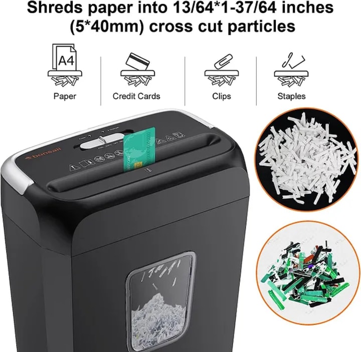 Easy Operation for Home Use, Auto start and manual reversal to clear paper jams make it easy to operate..The home shredder will shred continuously for up to 3 minutes before requiring a 40 minute cool down period. Continuous shredding of up to 130 sheets at a time (6 sheets at a time). Cross Cut & Credit Card Paper Shredder, The cross cut shredders with 6 sheets shredding capaci, no need to remove staples, shreds paper into tiny particles measuring 5x40mm, high-security level P-3, destroys credit cards (one at a time),also can shred staples, paper clips to keep your information safe. NOw cost -23% off £30.99, was £39.99.