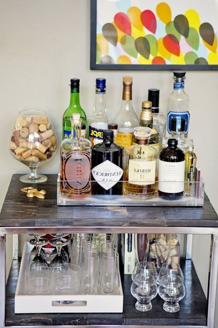 A side table could be transformed into a bar setup with just the addition of an ice tray. This allows you to store drinks and bottles in a classy style.