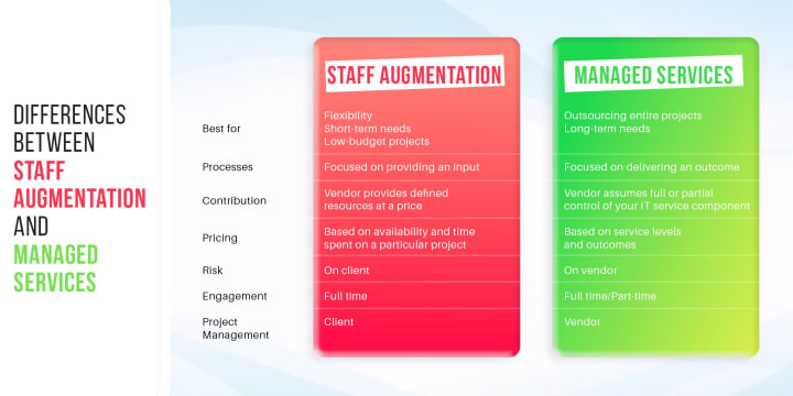 The vendor providing Managed Services owns all the potential risks in delivering the service and the specified outcome. As the price is fixed and tied to the delivery, the vendor implements all the productivity and risk management measures essential for meeting the commitment. They manage the extensive documentation and the implementation of tools and processes, instead of depending on individual employees to avoid risk. With Staff Augmentation, vendors assume no such risk, and all the preventive measures must be implemented and managed by you.