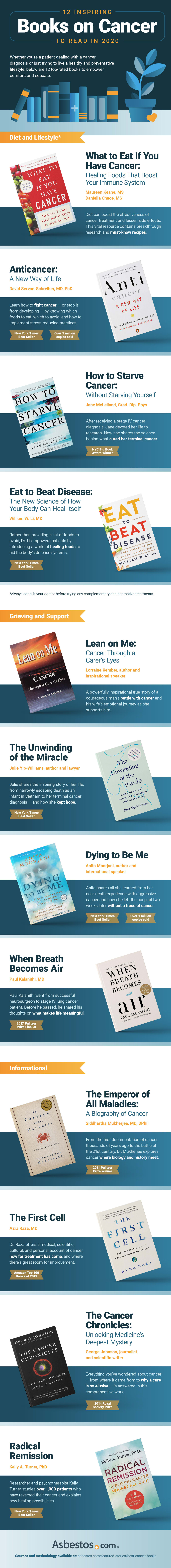 There's a seemingly infinite amount of cancer resources available. On Amazon alone, there are over 20,000 books on the subject. So rather than wasting time sifting through endless books, we've compiled the best of the best. From nutrition advice to information on the history of cancer to emotional support, these 12 cancer books are here to educate and empower. Remember to talk to your doctor if you have questions about cancer or suspect that you're at risk.