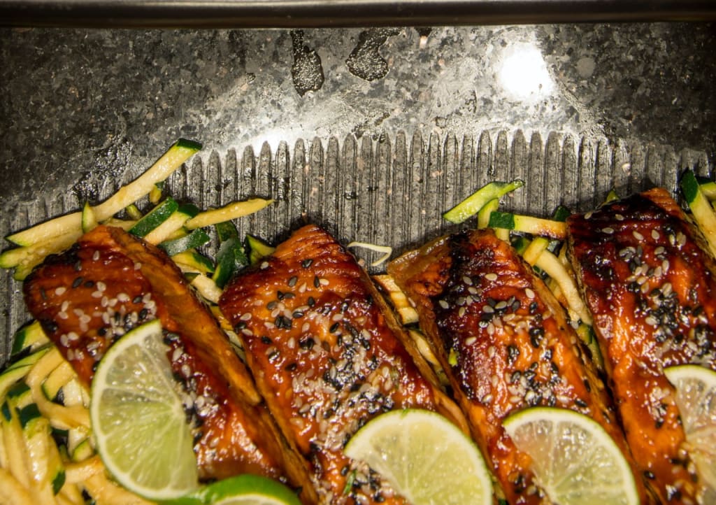 Option 3: Grilled chicken served with garden-egg squash, and zucchini along with a few tomatoes, cooked on flames with garlic in olive oil. Adding supplementary fats as pastes with coconut cream is a smart choice for nutritional balance.