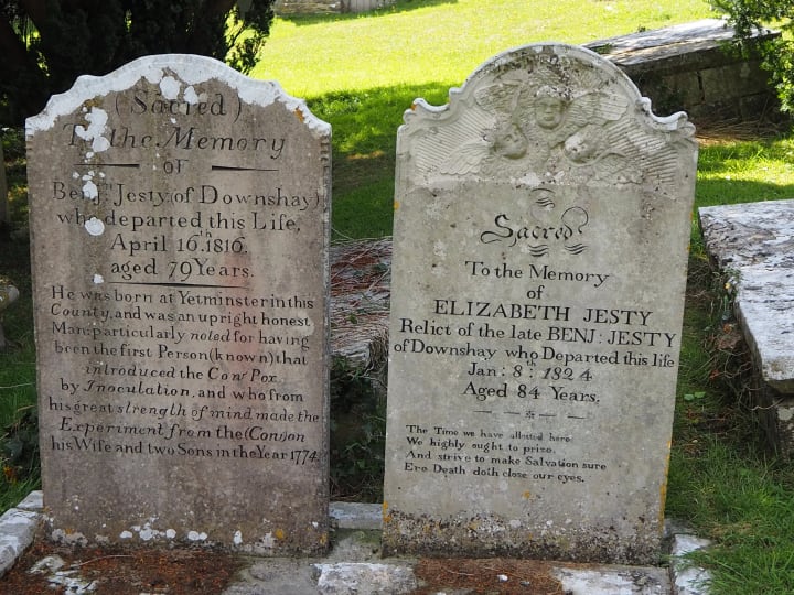 “Sacred to the memory of Benjamin Jesty of Downshay, who departed this life April 16th 1816, aged 79 years. He was born at Yetminster in this county and was an upright honest man, particularly noted for being the first person (known) that introduced the cow pox by inoculation, and who from his great strength of mind made the experiment on his wife and two sons in the year 1774”