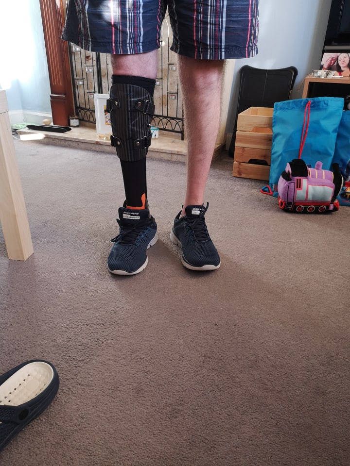 It’s made of a carbon fibre mixture and allows me to walk, run and drive all with it on and the difference is like night and day. It takes a bit to get used to but so worth it the pain score when I have it on is way down at 1 or 2 compared to 9 or 10 when I haven’t. It’s not just about the pain though when I’m not wearing it I need to think about every step and how I place my foot down, what kind of surfaces I can walk on i.e only really on flat concrete never on uneven ground. Can’t even walk on sandy beaches so I have to buy specialist footwear for that which must be suitable for the sea and public swimming pools but some in Scotland don’t allow me in with them on so get turned away.