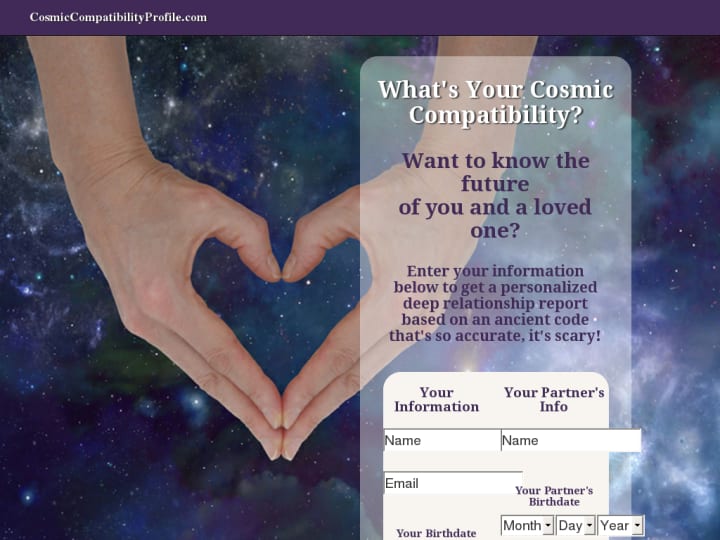 Cosmic Compatibility Profile is a step-by-step comprehensive guide program that is the world’s one and only dating system, Personalized Cosmic Compatibility Profile is a most in-depth report, that may shock some of you because it will reveal VERY much about your (hidden inner) self.