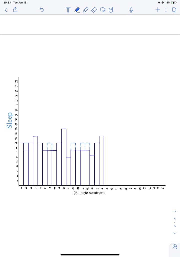 I filled it out using solid navy lines to represent my sleep at night and dashed blue lines to represent naps. Then I made the background white, here is my results for the last 18 days.