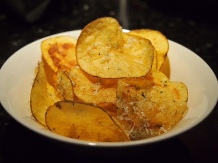 Cut the washed and scrubbed potatoes into 4" thick slices. Into a food processor, put the garlic, rosemary and olive oil. Pulse on and off to chop the rosemary and garlic finely. Line a baking sheet with foil and brush lightly with the rosemary flavored oil. Then lay the potato slices in one layer on top of the foil. Brush again with the rosemary-garlic oil. Sprinkle with salt and pepper. Turn and do the same thing to the other side. Bake in a 350 degree oven for 15 minutes—turn the potatoes and bake until they are lightly browned. Remove from oven and drain potatoes on paper towels. Serve while still warm.