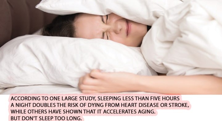 According to one large study, sleeping less than five hours a night doubles the risk of dying from heart disease or stroke, while others have shown that it accelerates aging. But don't sleep too long.