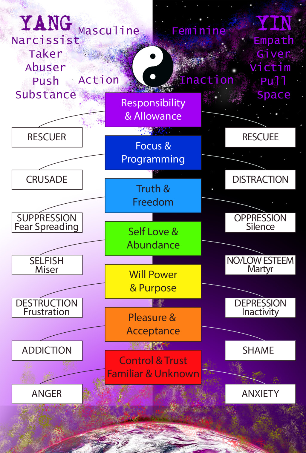 7 – The first or last separation, depending how one looks at it, is Responsibility. It is in Crown, we must take Responsibility of our lives in the body and home, our actions and behavior, and our thoughts and beliefs. Only we can save ourselves. It does not matter how we got to this point in our lives and pointing fingers at who is to blame. It is about picking up the reigns of the horses and consciously guiding the wagon. Until we realize this, we are a passenger on that wagon being tossed about with no one driving, simply being along for the ride and complaining about it. In Responsibility, we are neither waiting to be Rescued nor being the Rescuer to anyone else. No one or thing can “fix” our lives for us and we can't "fix" anyone. It is up to us to find our own answers.