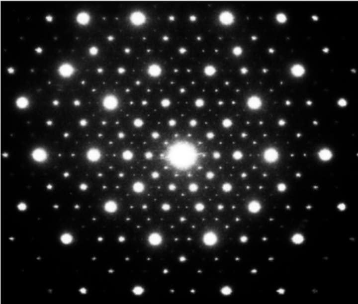 The above image is a rendering from a transmission electron microscope. It captures the diffraction pattern of icosahedral symmetry which is encoded into the miraculous mineral known as Icosahedrite, the first natural quasicrystal discovered on Earth.