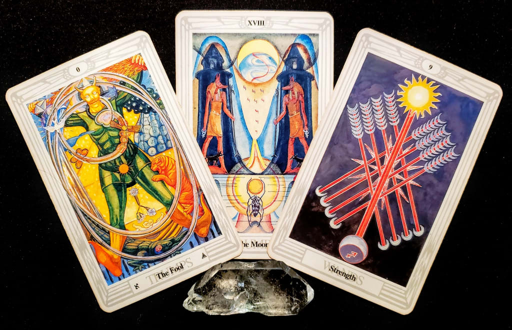 Here we have the fullness of our personal strength. Positively in that the light of clarity and our connection to the Divine shines into areas that can be difficult for consciousness to access and negatively it may show itself as an emotional power surge which can cause over-bright responses or short out the energy of a situation entirely. As we work with the energies of both the Moon and the Fool we find the depths and heights of the whole spectrum of our emotional selves. What feels like the passion of our primal connection to Earth and humanity shows itself with the all and nothing possibilities of the Void. In wrangling these larger than life emotions and connections we will need the strength of our cognitive decisions. Yes, we see and feel everything from the depths of what can feel like an abyss, but... It is from here that our strength and the connection with our articulate brain can find the thread, our direct connection to the pure creativity of the Universe.