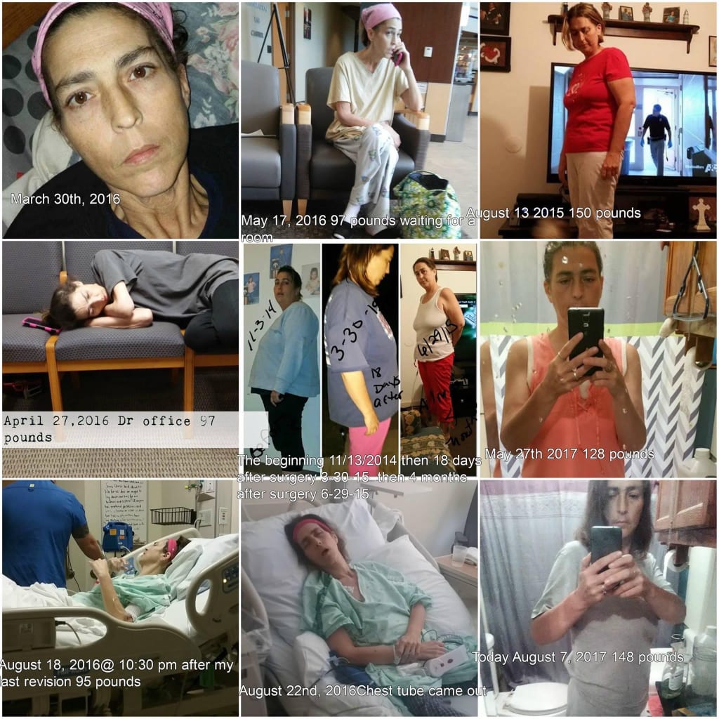 This is my many and endless days and months I spent in and out of the hospital from having complications from weight loss surgery. There was times I didn’t think I was going to come home from the hospital and a few times I shouldn’t have. I weighed 277 when I went into have the surgery and in 9 month I was 95 pounds it was a roller coaster for me. Having two kids at home under 18 and not knowing from one day to the next was hard. My son ask “mom are you gonna die on me” and that broke my heart. I had my surgery on March 15, 2015 everything went well two days later I went home. Then on Easter Sunday 2015 I got sick I thought it was because I was with friends at a cookout and could eat what they was having and it was hot out. Went home ended up going to the emergency room around 4 in the morning I was dehydrated and in major pain. I was there a few hours they sent me home, and I went back on Wednesday morning still sick throwing up so by this time I am thinking I am sticking from helping my friend because her five kids had been with with a stomach virus. The emergency room doctors wouldn’t call the surgeon and talk to him about me being there and this was just three weeks after surgery. When I went home I called his office and went in on that Friday to see him and he admitted me to the hospital I spent a week he did a scope and stretched my stomach because it was closing up. By May I was having my first revision of this surgery. At this time I had been in and out the hospital more than I was at home. In July he removed my gallbladder and by September I was having the second revision of the surgery. Nothing seem to be helping. At this point I would be home maybe 24 hours after being released from the hospital before being admitted again. I spent the entire month of November in the hospital having my third revision of the surgery and by this time I had about 21 scopes done. I was in there for Christmas and New Years and went home 12 hours later I was back and had to have a feeding tube placed because by this time I only weighed 95 pounds and still couldn’t eat or drink anything. Still spending countless days and nights in the hospital feeling like there was no hope insight I felt hopeless. Finally in August of 2016 I had my fourth revision a two and a half hour surgery took five and a half hours my left lung collapsed 30 minutes into surgery they had to place a chest tube before finishing surgery the worst pain ever. I finally got the feeding tube taken out two weeks after I went home and I started gaining some weight back. The worst surgery of all was the one that helped me the most. There was many time I should have never came home from the hospital but did. It took me two years to gain weight back to be a normal healthy weight. And for the last two years I have maintained a weight of 150. I still have issues but nothing like on the beginning. If you would have ask me back then if I regret having it done I would have said yes, but now I look at it that I was blessed and I am still here for a reason and I don’t question that reason. I have many people ask me many questions about the surgery and if they have had it and have problems they really ask me questions. My advice to anyone when it comes to weight loss surgery is do your research and think long and hard about it before making your decision. Make sure you also have plenty of people to support you and stand with you regardless your decision because only you can make that decision. Many will say it’s the easy way out but what they don’t know it’s really not because this surgery changes your life forever regardless whether it’s good or bad it changes your life and you.