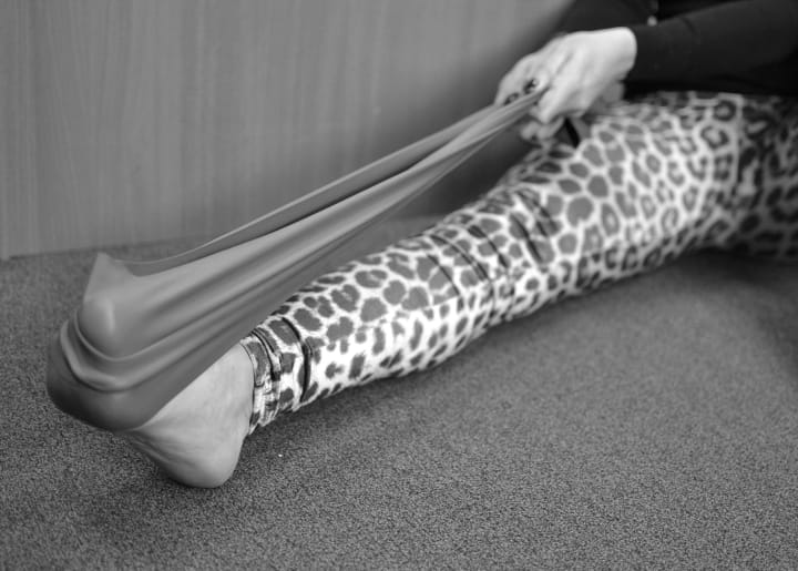 - Slowly point and flex your foot against the resistance of the band and repeat 32 times