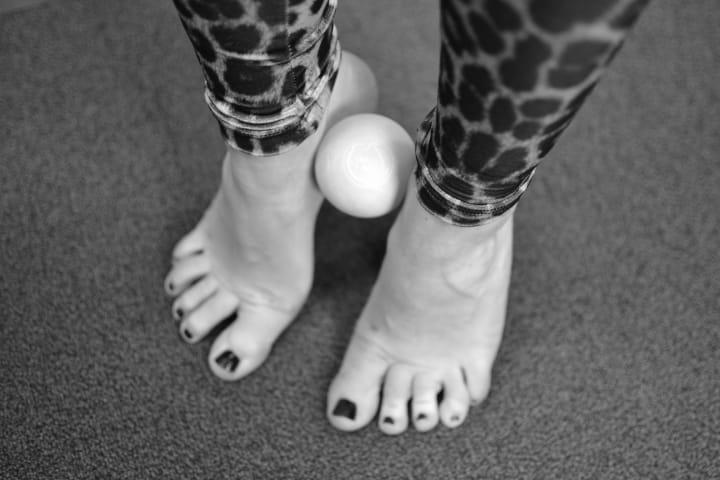- Squeeze the ball gently between your feet and slowly rise up to demi-pointe (the balls of your feet) moving through each section of your feet before getting to demi-pointe. Actively maintain your alignment by focusing on keeping your weight balanced as you rise up and down. If this is hard to start with, you can begin the exercise holding on to a wall but try to aim putting your weight gradually into your feet.