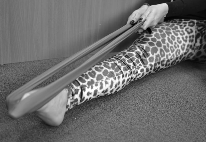 - Wrap the stretch band around the ball of one foot, keeping your back upright, sit tall and pull band across the outside of your foot, away from both legs