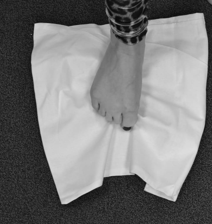 - Stretch out your toes and then grasp another bit of the towel to curl. Continue this on both feet until you have bunched up the whole towel