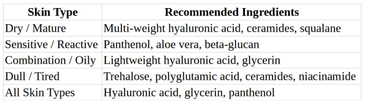 Recommended hydrating ingredients by skin type
