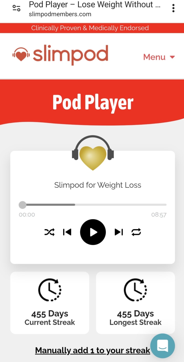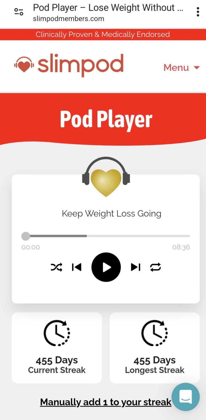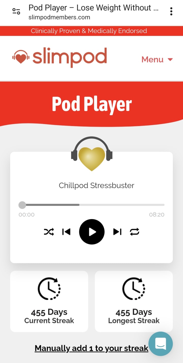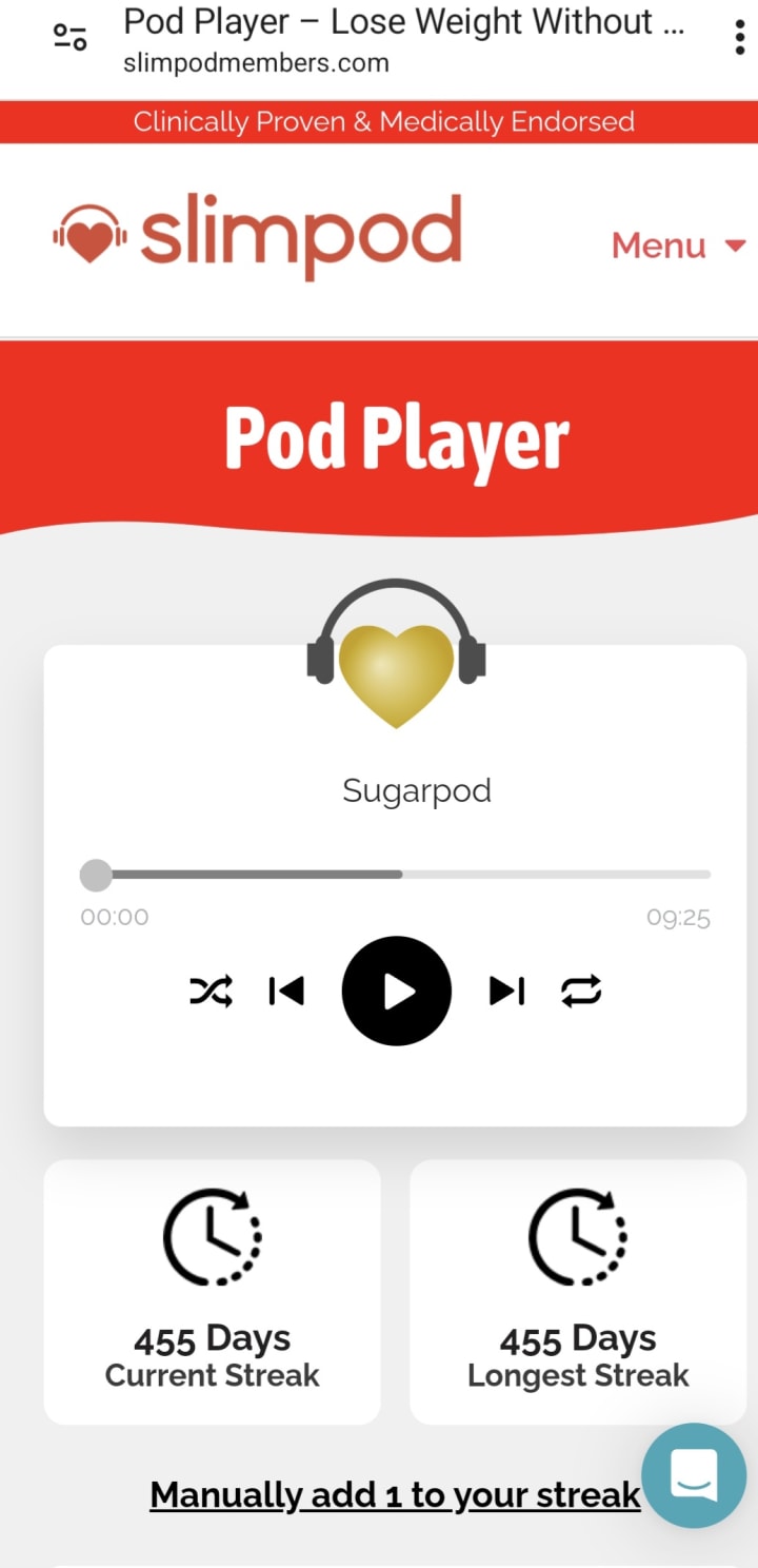 I currently use Slimpod for weight loss. I listen to pods every night. The first one I listen to is a Chillpod Stressbuster relaxation pod. You can listen to it during the day, at night, or whenever it suits you. I listen to it before I go to sleep and then, I listen to the Slimpod for Weight Loss pod which enhances my mind and makes me fall asleep. It works like a hypnosis that trains your mind not to overeat. I also listen to a Sugarpod, a Keep Weight Loss Going, and a Fitpod Motivator recording whenever I want daily. These are downloaded to your mobile phone and have them wherever you go.
