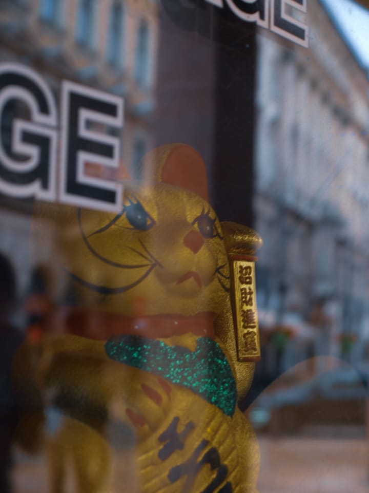 The “lucky cat” with its raised paw is said to welcome abundance in one’s life.