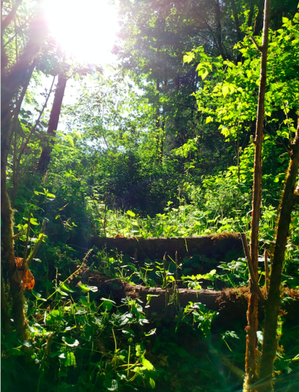 The abundance in nature was calling to me and the constraints of my yard, which were only bushes, not neighbors or busy roads, opened up my trapped mind to see how much more there really was out there for me. I searched for the perfect spot to start clearing back the overgrowth and found myself before a dramatic patch of Salmonberries. With the loppers fully extended I hesitantly snipped and cut from afar. Keeping distance as to not get hurt at first, I made a dent and called it a day.