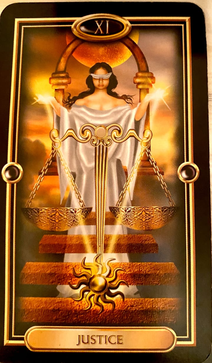The woman is blindfolded and solely relying on her sense as she is coming towards the feminine energy “Libra” scales ⚖️, and emitting the brightness of the masculine energy from the Sun to the heavens.