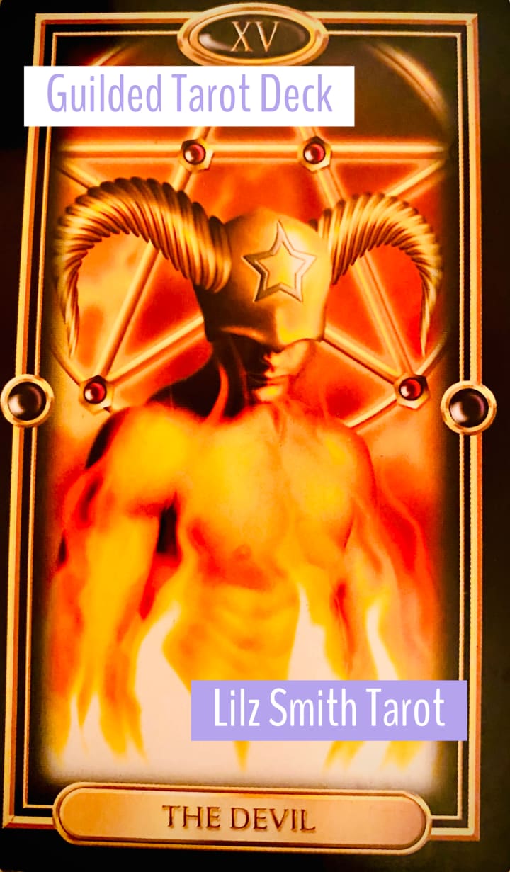 The devil in this tarot deck is represented by a man in physical form in flames and a large pentacle behind him.