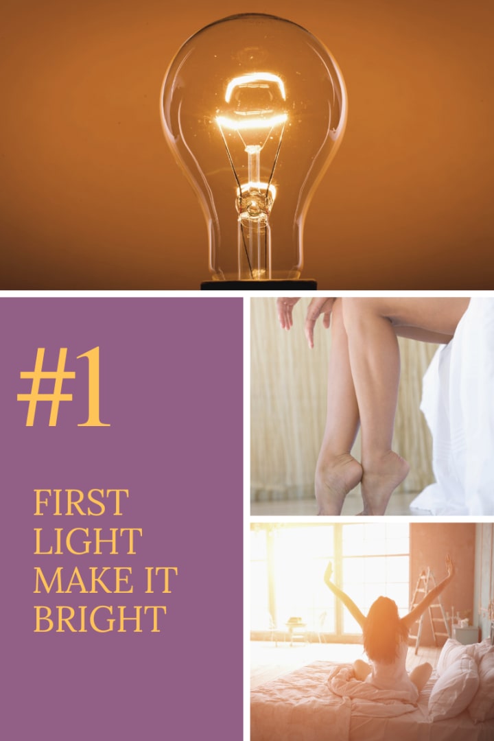 AS SOON AS you open your eyes, turn on the light and sit up on the side of the bed. Try not to stretch and adjust your eyes while laying down. This can help jump start your energy and help keep you going all day. The first 15 minutes create the essence of the day. So make those minutes count.