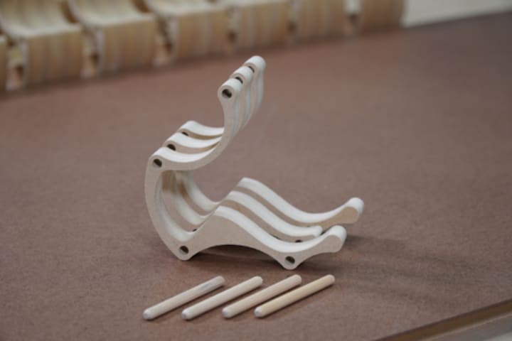 It took me several iterations to come up with a design that not only looked cool but one where the assembly was simple and easy. The kit consisted of four wood dowels that connected three wood parts to make up the phone holder.