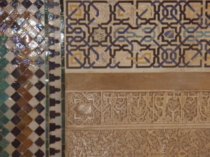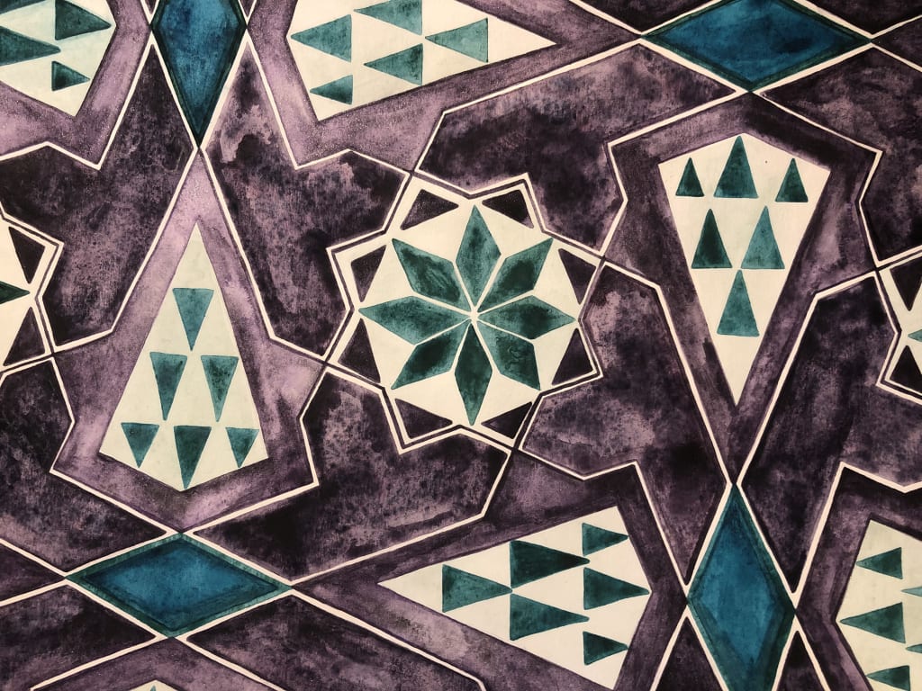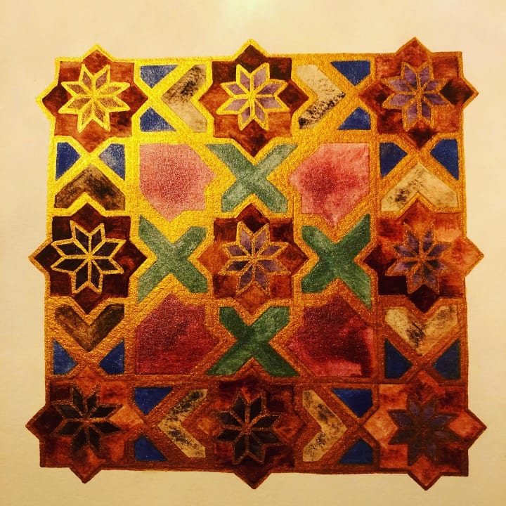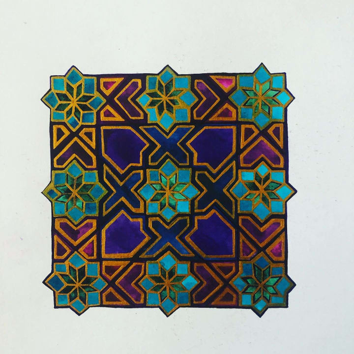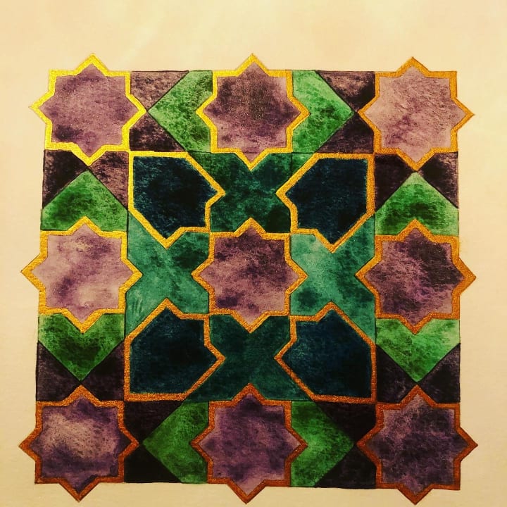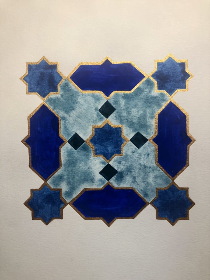 My story with this art form began over a decade ago when I visited the Alhambra in Spain. I had been reluctant to travel anywhere that would take me away from lounging in the sun. I had no idea that I would be transfixed from the moment I arrived and that it would be love at first sight. It was like I entered a time warp and another dimension of my reality. I had found a portal in which I wanted to remain in forever. There was mystery and meaning in the ceramics, plasterwork, and carvings. My essence felt radiant as I passed under arch scallops, horseshoe arches and other prominent Andalusian architecture. I stayed there for as long as I could before being ushered out at closing time. I was mesmerised with this place, and it felt like home. Having been born into Islam, and growing up Muslim and then later Christianity, I felt this place represented me like no other. The contrasting parts of me were accepted and I belonged.