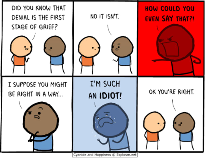 Practically a cartoon representation of the stages of grief. (I do not own this picture by the way) Image found on google