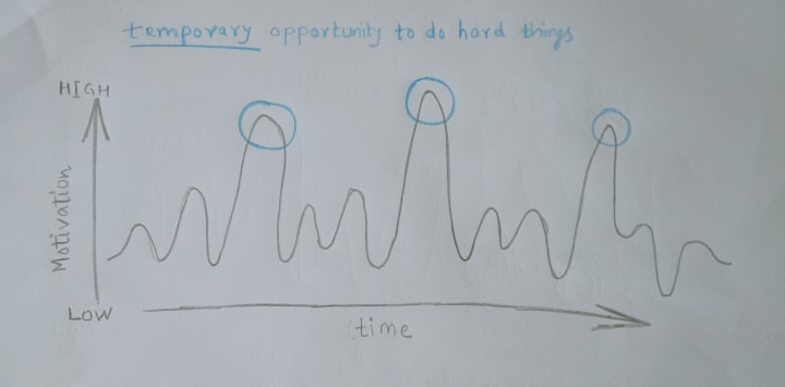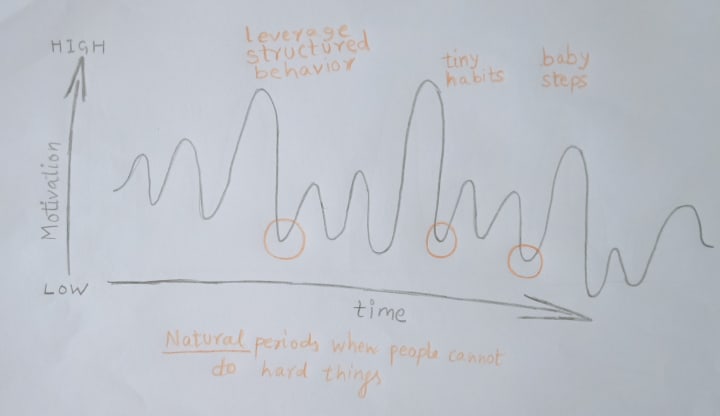 I learned about the motivation wave, popularized by Dr. BJ Fogg. He explained - High motivation is required to do hard things, you need to be prepared for the natural periods of motivation when you can not do hard things.