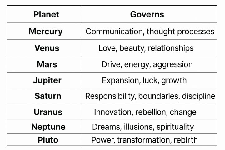 Each planet in your chart rules a particular area of life. Here’s what they mean: