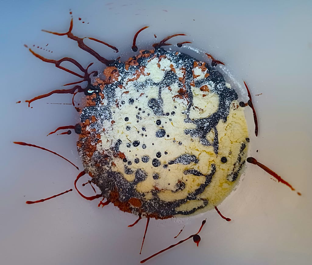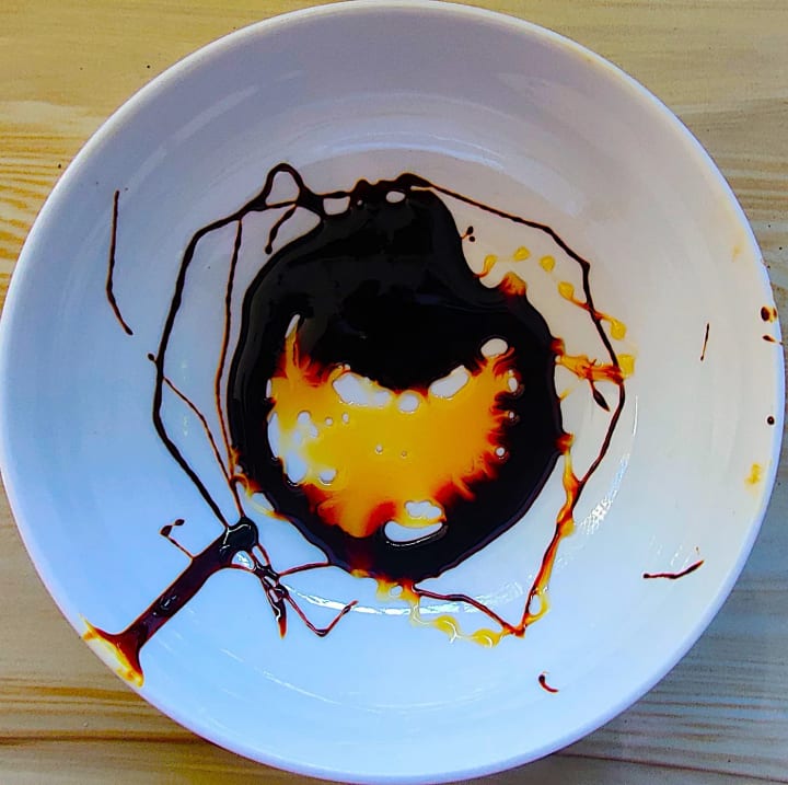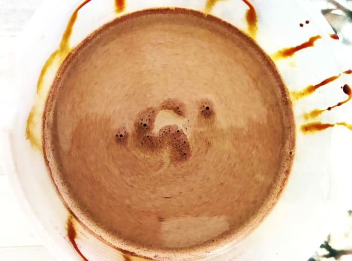 Look at the images. I call them Tea Art. The left image shows molasses, vanilla-powered soy milk, and Swiss Miss chocolate. It’s beautiful, unique, and one of a kind.