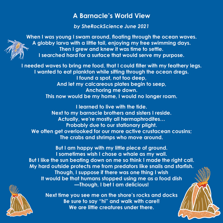 I offer snippets of science. My beach day was filled with watching the barnacles open with the waves. Sealions swimming by. Seagulls swooping in for a snack. Sandcrabs scurrying in the sand. Seaweed stranded on land. Ocean swimmers training for a marathon. Musclemen trying to push their limits. A little boy excited for the waves, but also scared for his dad to go deeper into the ocean leaving him ashore. An 11-year-old girl seeing how far out she could go to sea and still stand in the waves. Sun baked people burning beneath the skin. In the world I see the science behind all the things that surround me.