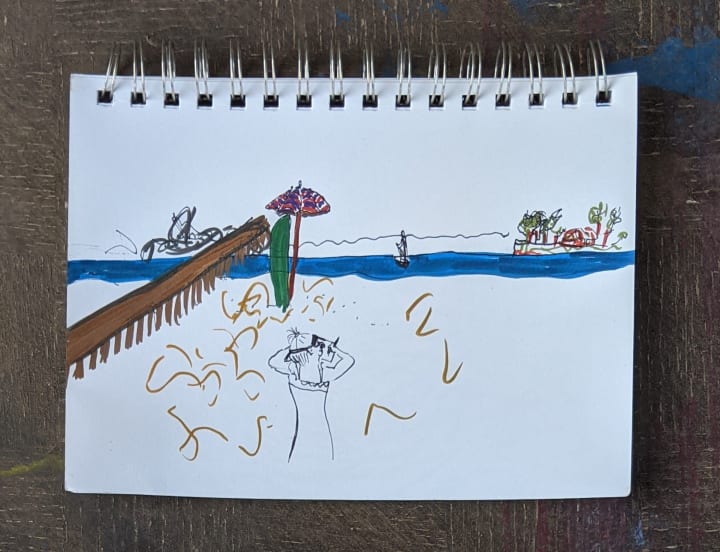 I take in my day. I take in the beach, the waves, the sun, the sounds. I start to draw a self-portrait. My view. I draw what I feel. I feel the day around me.