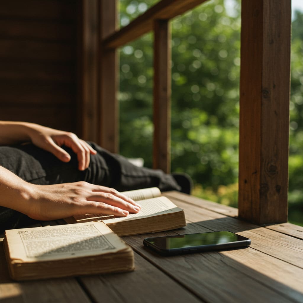 The best part was the book. I found a real book—paper pages, a heavy cover—and I started to read. When I read a book, my mind only has one thing to do: read the words. It doesn't jump between five different apps. I read for hours and hours. I felt the most **peaceful** I had felt in years.