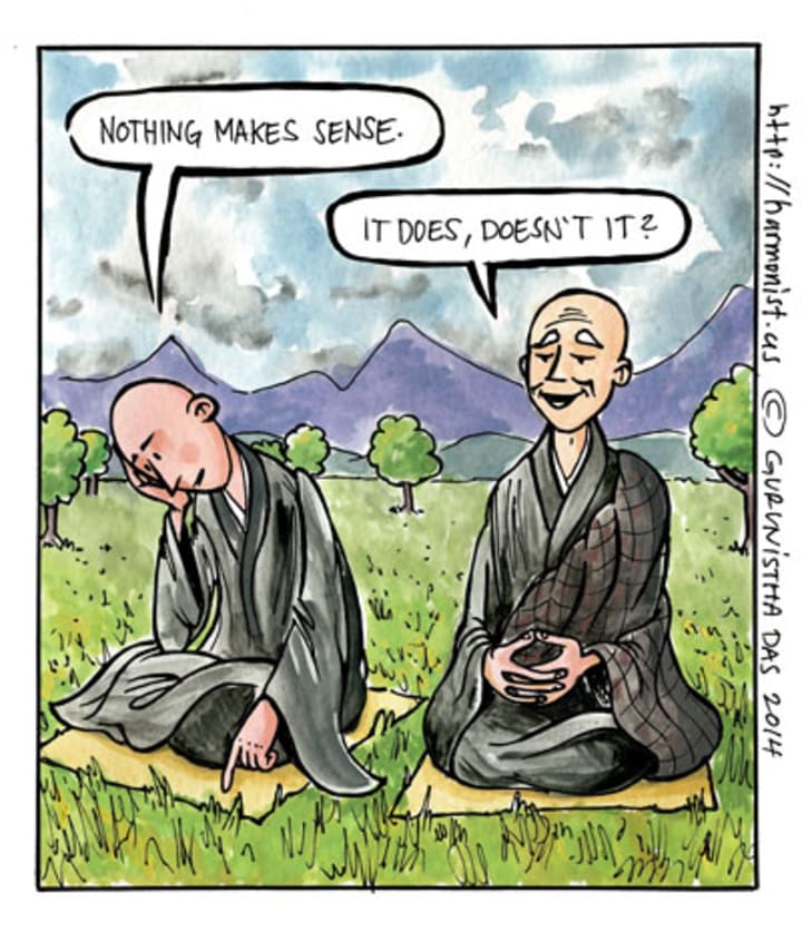 There's a picture of two monks sitting next to each other. They've just finished meditating. After a moment, one monk with a puzzled look on his face says, "Nothing makes sense." The other monk smiles and says, "It does, doesn't it?"