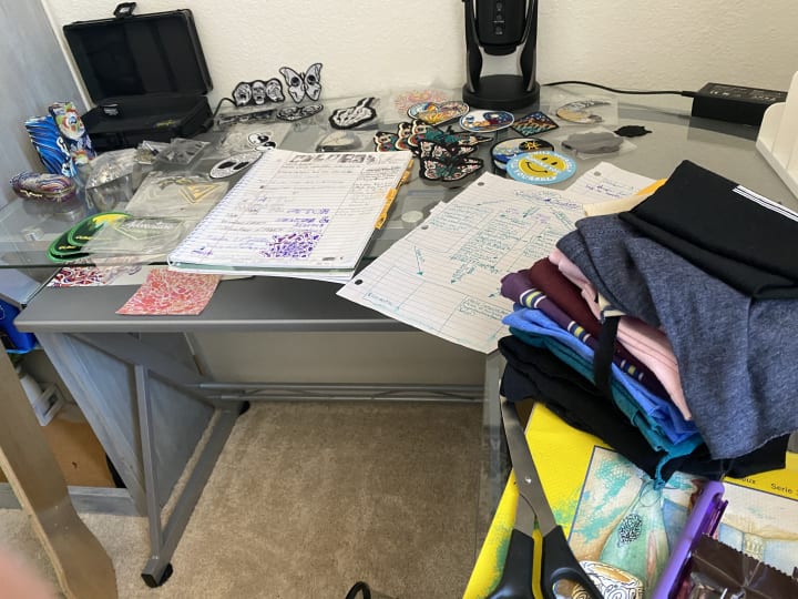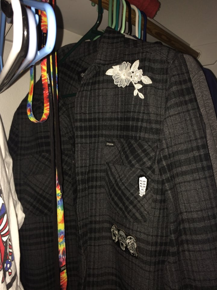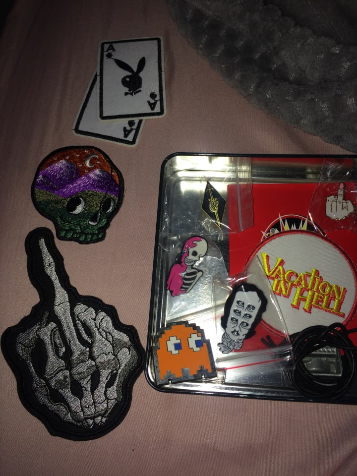 Custom patches, patches from local artists, designs of exponential energy. Custom embroidery dedicated to my aunt who recently passed, she was so happy to show off her “easter shirt” to everybody, with embroidered flowers throughout the design.
