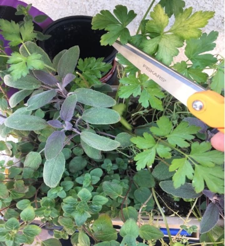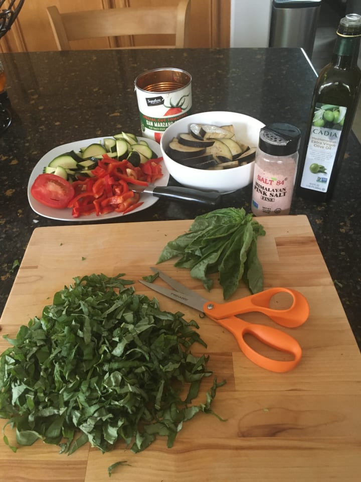 Having a garden full of herbs and vegetables for a chef is a dream come true. You get to choose your vegetables at their peak of ripeness, and can create dishes of exceptional quality, right from your own backyard. Herbs should be trimmed with a good pair of sharp scissors rather than plucking them to prevent damaging the plant and to encourage new growth. It is also better to use scissors instead of a knife to chop herbs to prevent bruising the leaves. In the picture below, I’ve made a chiffonade of basil with my sharp Fiskars scissors to add to my tomato basil soup.