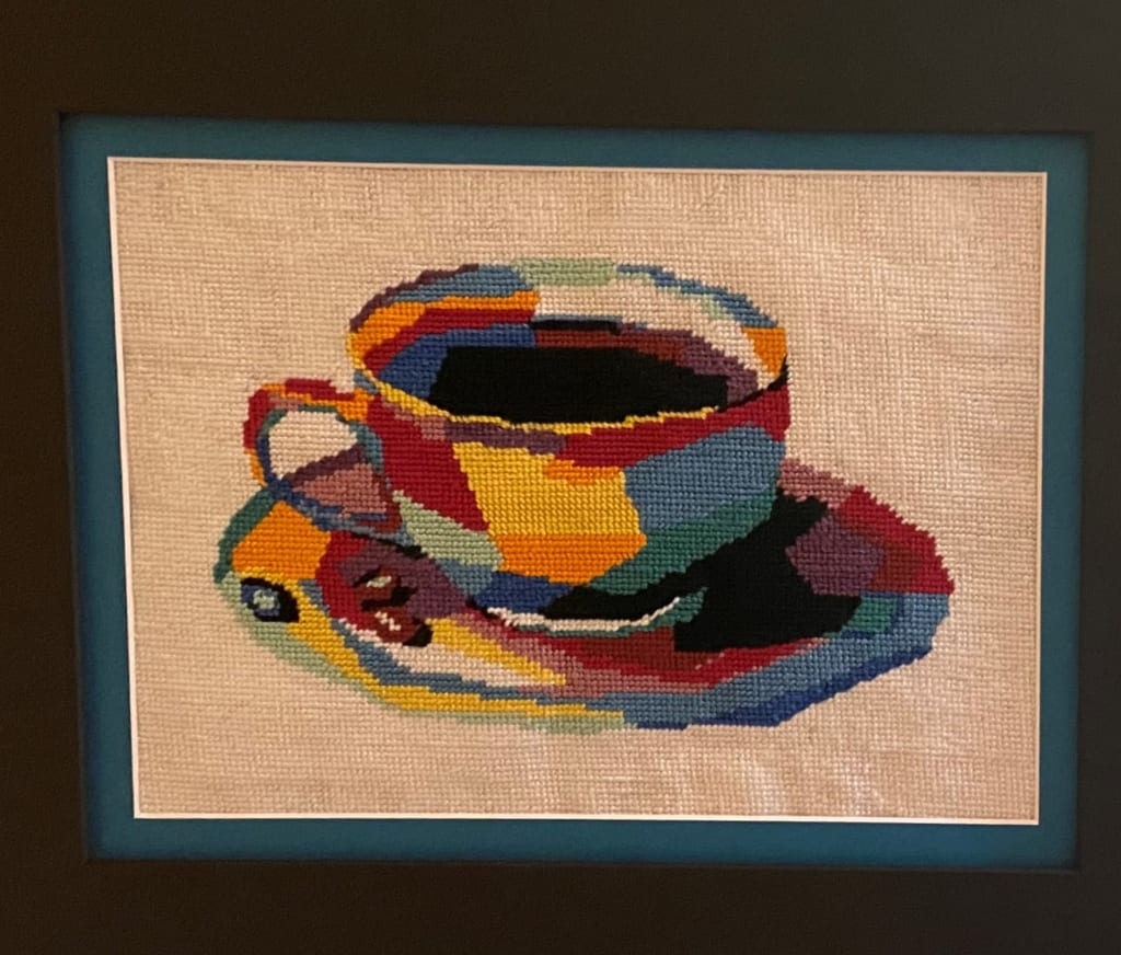 Sarah’s finished piece inspired me to try again. I started to browse online and look for ideas. After a week or so or thinking about it I settled on an abstract coffee cup needlepoint design. It took about a week to arrive and I then sorted the threads and put a basket together with scissors, needle and canvas. I remember the first night of moving the thread through the canvas, hours of work for a few inches of progress. I worked through the colors stitch-by-stitch keeping the ends trimmed close on the reverse side. The inches began to add up and I was slowly completing my first project. Four months after that first completed stitch, I hung my abstract coffee cup proudly in my dining room