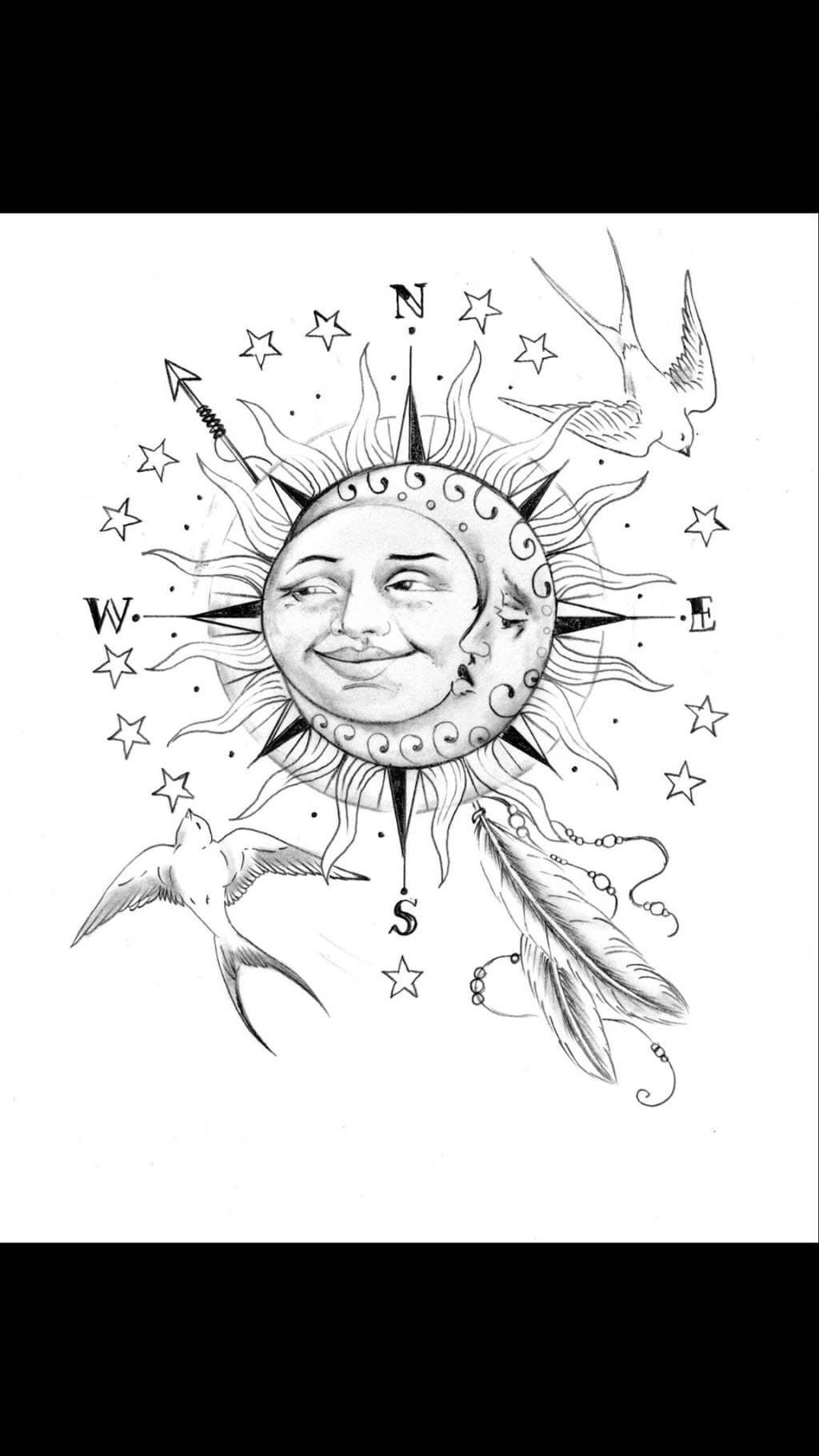 So, upon my shoulder I have a compass. The 13 stars of the country I love around it. I’m from NJ, so to represent the original country. I am original. Upon the compass is the sun and moon. I used to tell and still tell my nieces that I loved them more than “all the stars in the sky “ and they would ask “if I loved them more than the sun and moon?” I expressed that to show my love, I would live in darkness and be content.