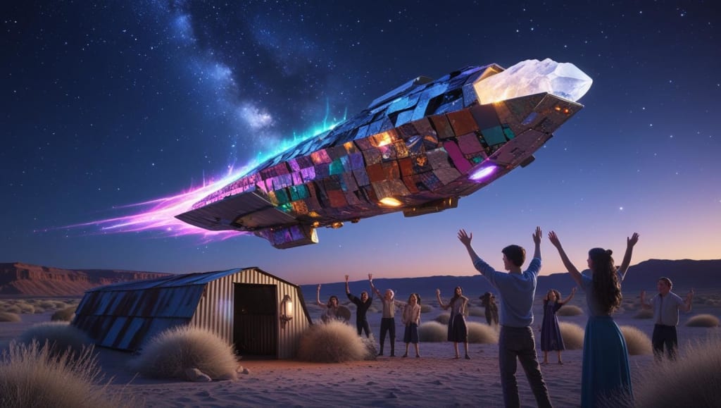 Eyes closed, Eli conjured the universe inside his mind—stars close enough to touch, swirling galaxies, worlds waiting to be born. The crystal blazed to life, bathing the shed in a strange glow. A crescendo of whirrs and rattles, and then—lift. The makeshift ship trembled, then soared, its patchwork wings cutting through the night, painting the sky in auroras of raw invention. Lila’s joyous shouts fell away as the world shrank below.