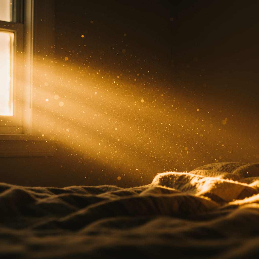 He saw small bits of dust floating in the sunlight from the window. He watched his cat, Archimedes, jump on his bed. The cat was usually gone quickly. Now, the cat just slept, quiet and easy. The cat seemed to know how to just be.