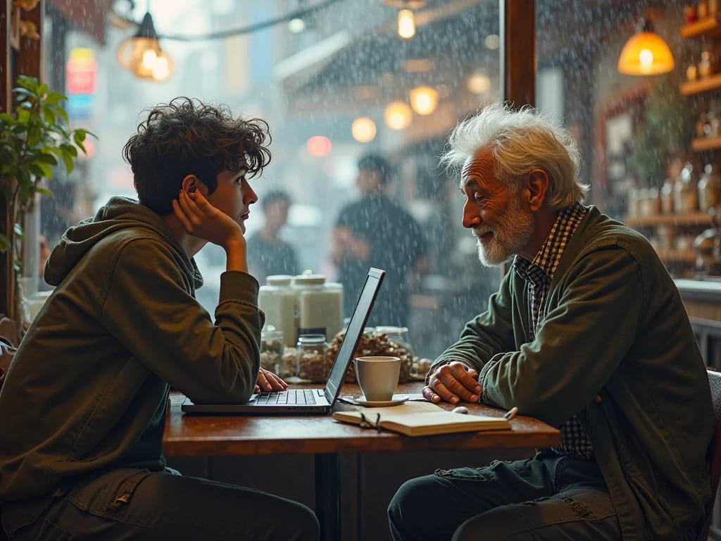 He was older, late 60s, maybe early 70s, with a face etched by time—deep lines around his eyes, a jaw that suggested stubbornness or wisdom, or both. His white hair stuck out in wild tufts, defying gravity, and his outfit was a patchwork of eras: a faded green jacket that looked like it had been through a war, a checkered shirt with a missing button, and trousers so worn they seemed to carry stories of their own. He held a small notebook, its cover creased and edges frayed, with a pen tucked behind his ear like an afterthought. He didn’t order anything, didn’t even glance at the counter. Instead, he scanned the room, his gaze sharp and deliberate, and for reasons I still can’t fathom, he zeroed in on the empty chair across from me.
