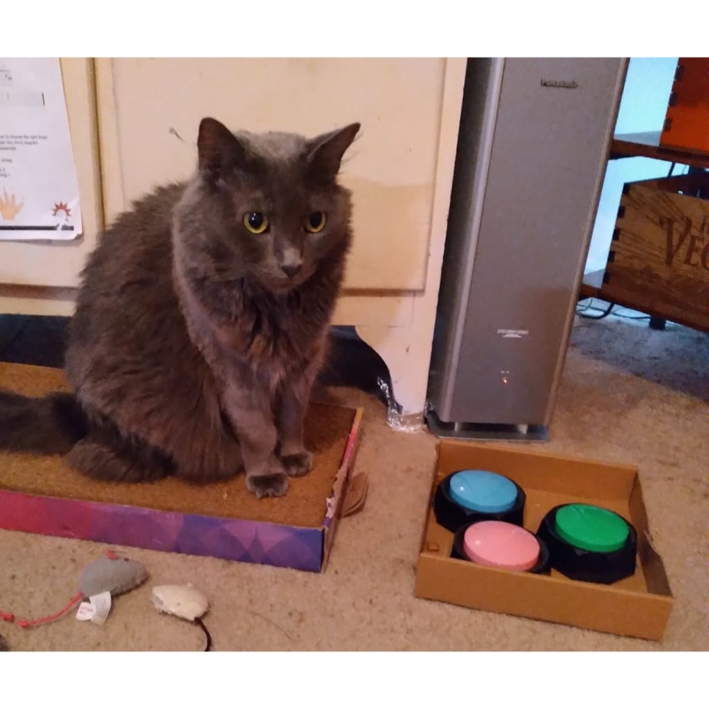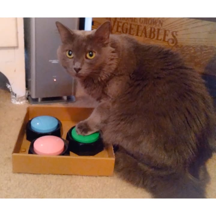 During the COVID-19 pandemic I began to watch videos of dogs using recordable buttons to talk to their owners. Bogie is very intelligent and sometimes seemed to get frustrated. I wondered if, like children, communication issues could be the source of her frustration. I set out to teach her to communicate through the buttons.