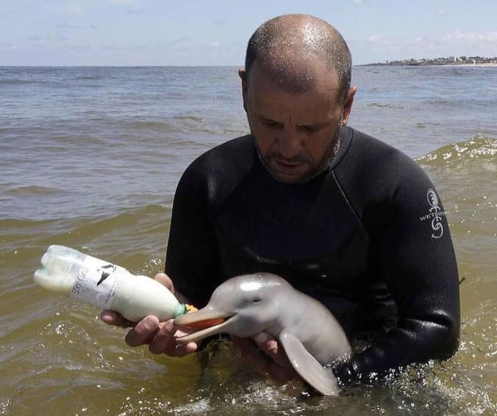 For the dolphin to survive, the human rescuers patiently took bottles to feed it.