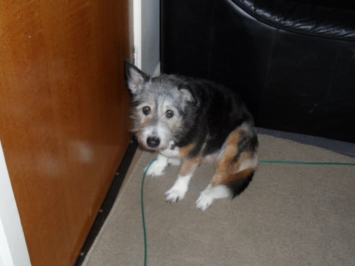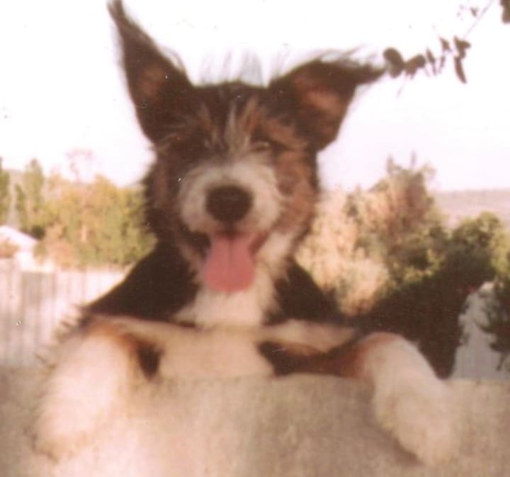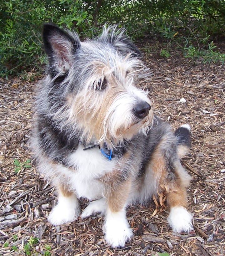 As neither my Gran nor I could bear to part with her, Monkey found her home with us. Monkey’s looks changed from the strange to the unusual, her Blue Heeler coloring mixed in with shaggy black fur. Although she retained the intelligence of her Blue Heeler heritage, her body shape was unmistakenly terrier.