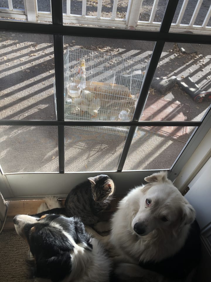 Eli, with his doggo friends, watching over the chicks outside.