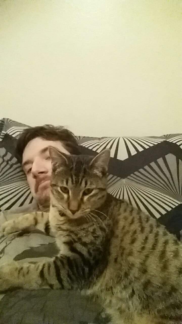 We looked at some dogs, and gave them some love and attention. We looked at some kittens, and adored their clumsy behavior. All these potential adoptees had their own cages, but when we got to the room for free-roaming adult cats over one year old I knew it was trouble. Being that they are not confined, there is more opportunity to observe their personalities, such as their inherent unassisted playfulness, how they interact with other cats, and how they react to being approached and touched when they can run away. I happily caressed several of the cats in this room, but there was one that stood out. He checked all the boxes and then some. Okra was his name then, a 6-month-old cat that really wasn't even supposed to be in this room, but man did he sway me into bringing him home with me. When I approached him initially, there was no hesitation to contact. When I left his space, he followed quietly. When I sat to rest, he climbed on my lap. When I put my face to his, he pushed his face against mine. He purred, and it was noticeable and unique. He lets out a sort of higher-pitched falsetto-like whimper on the outbreaths of his purring which I found to be incredibly adorable. He had some reflexive drawbacks when I touched his legs and feet, but it didn't cause him to run away. He didn't mind being picked up and held, and when being put down he did not try to jump away. I knew I wanted this cat, and, even though it wasn't the plan, I knew it so well that I had to have him that day for fear that someone else might adopt him before I could come back. So I adopted him, dubbed him with the name Fitz, and have never looked back.