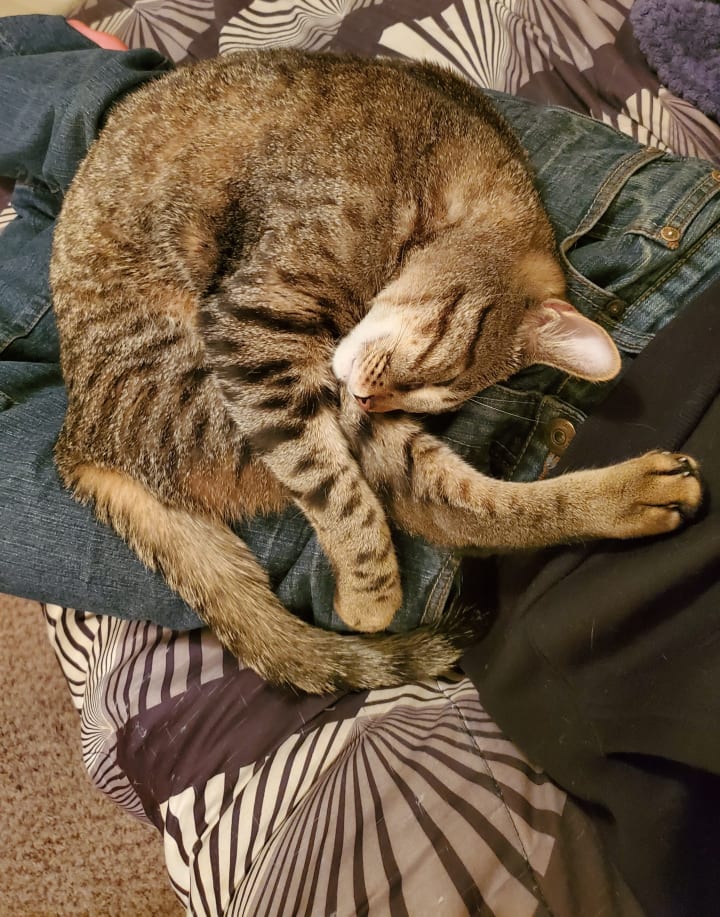 The more I think about how I came to adopt my beloved cat, Fitz, the more I think it was just meant to be. I won't pretend to know the exact day I adopted this friendly feline: not because it's not important, just because I have a hard time mentally tracking dates. It was sometime in late November of 2019. One of my good friends from work had heard me talk many times about wanting to have a cat to bond with in my recently-moved-into apartment, but I'm sure I'd also told her that I wasn't quite ready to adopt yet. It was financially doable, but I generally try to have a safety net of emergency funds. Perhaps I just needed a little push to take the leap of solo pet ownership. I'd almost always had a cat around staying with my mother, but it had been some years since enjoying the longstanding presence of a cat companion. And I'd certainly never been the sole caretaker; I think that was the real cause for hesitation. Anyhow, it came to be that while I was out with my friend we ended up visiting an animal shelter. She had two cats of her own already, and I think she was just really excited for me to have one for myself. I didn't yet realize that her goal for the evening seemed to be putting me in the environment most suited for me to give in to committing to adopting a new pet. We just "ended up" at the adoption center to "look" at the animals, but it wasn't a zoo. I knew this was a trick, and I certainly fell for it.
