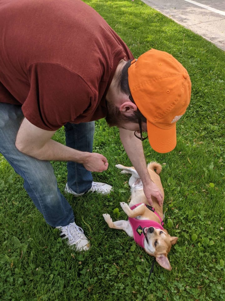 Kirby is an adopted dog who was found roaming in the Ozarks in Arkansas. The stray pup was taken to an animal shelter, and then he was brought up to Michigan to another shelter. At this point, he was taken to a foster home, but unfortunately, he couldn't stay there long because his caretaker couldn't look after him, so he moved to yet another foster home. At this point, my girlfriend set up a meeting with him, and we met together at a pet store. We were getting our first dog together, and we wanted to make sure it felt right.
